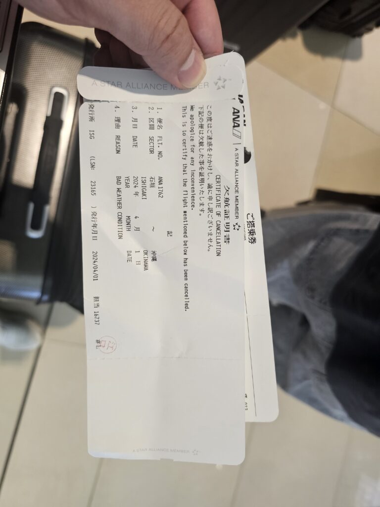 전날 밤 악천후로 인해 나하에서 이시가키로 오는 비행기가 결항이 되서,