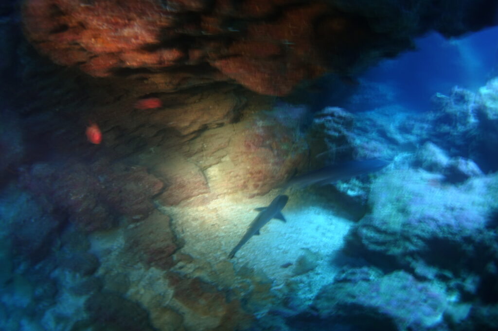 이쪽에 가면 늘 도망가지 않고 상어굴에 아기상어들이 있습니다-! 어두우니까 저처럼 카메라보다는 고프로를 사용하시는것을 추천드려요 – ^^ 화이트팁 상어입니다-!